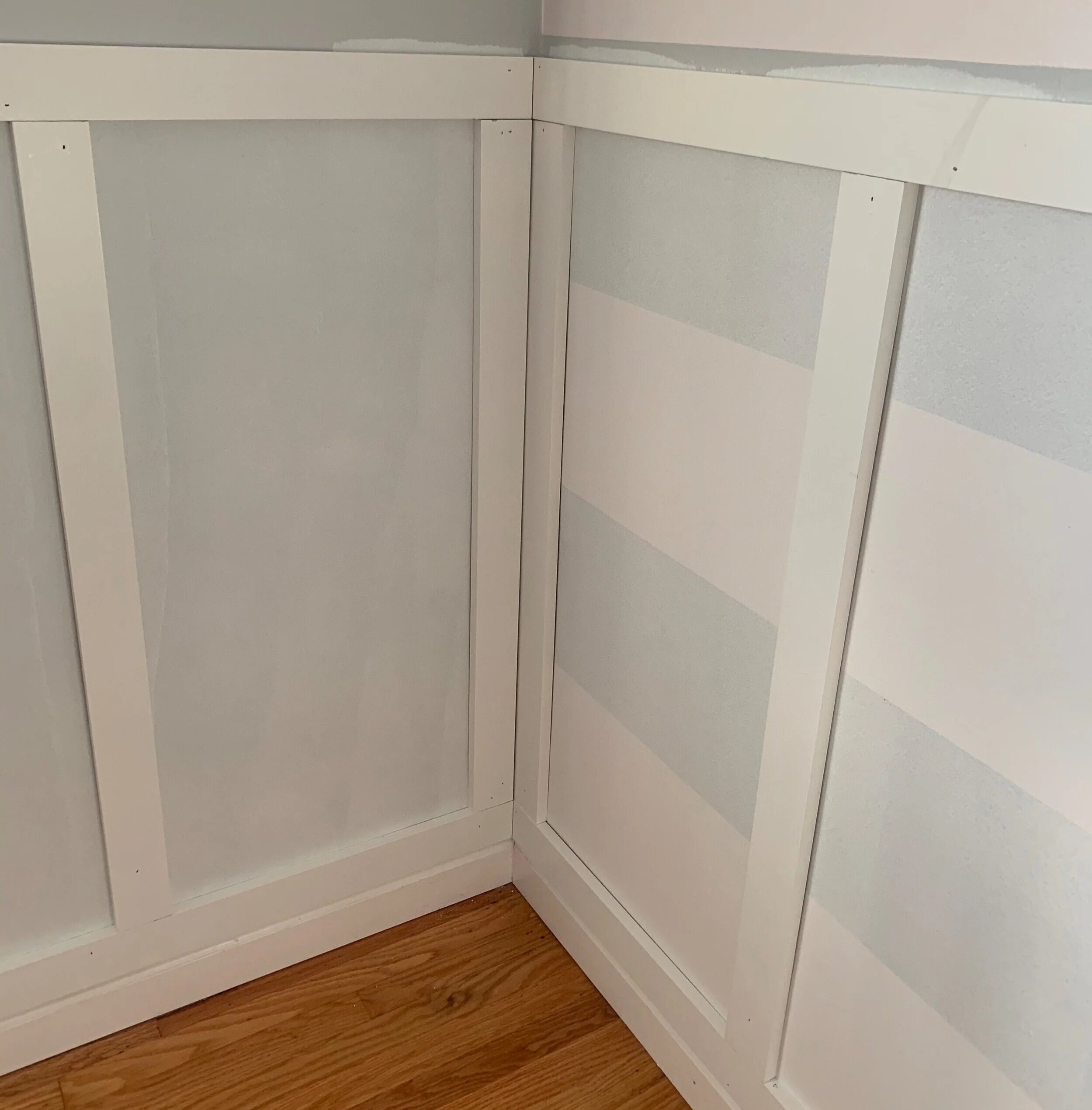 Once all the seams and holes were filled it was time to paint! We used a semi-gloss paint for the wainscoting to give it a slight sheen. You can see the finished product below.