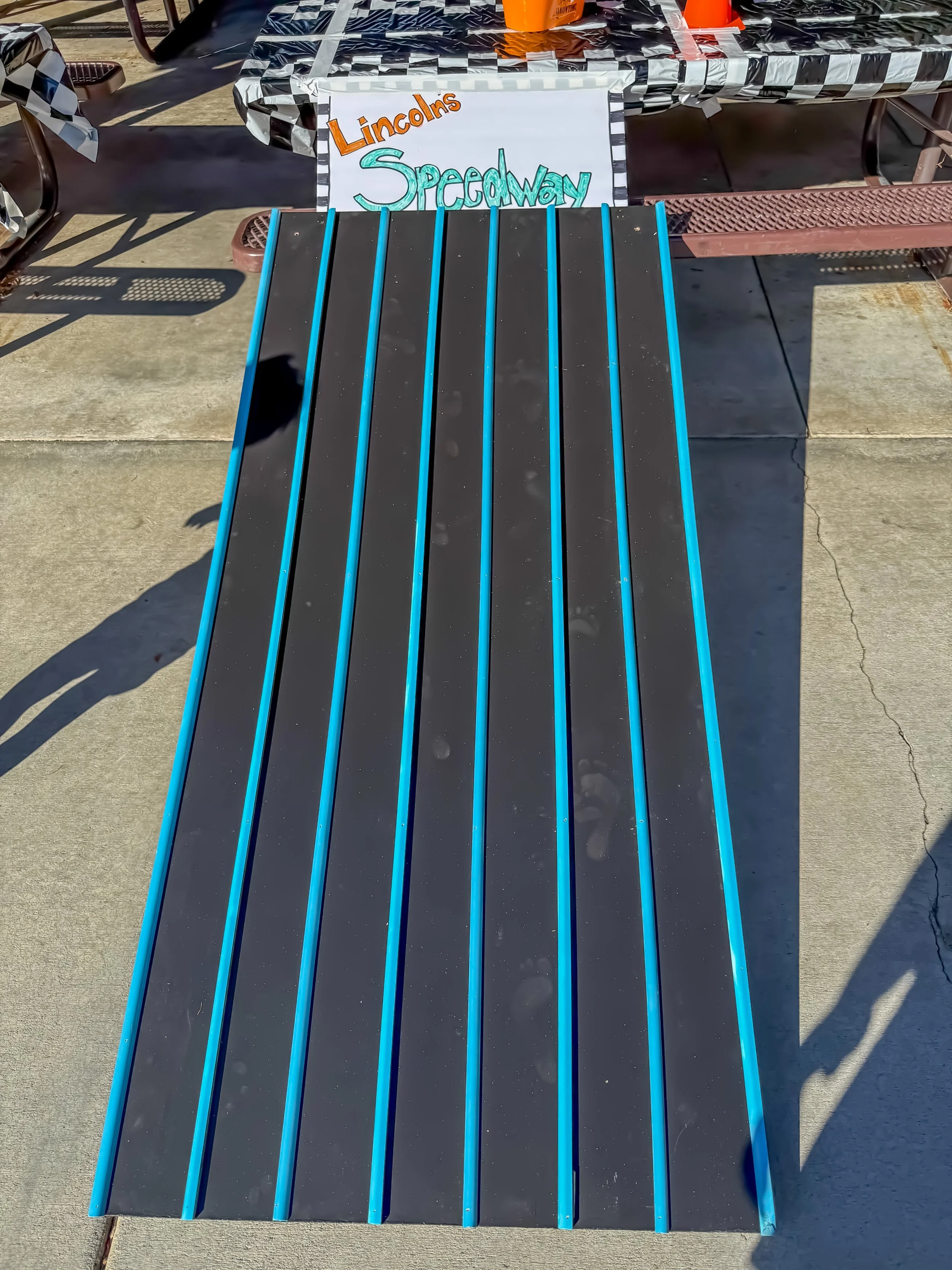 My husband and Mother-in-law built this car track for the kids to have car races on. We used an old door from our house we were getting rid of as the base but you could also use a sheet of plywood. We used quarter round molding to nail down strips of wood to create separate lanes. When the kids had finished eating I let them each pick a hot wheel out of a box to use for races. They took them home with them as well as the ones I had packaged up as their party favors.