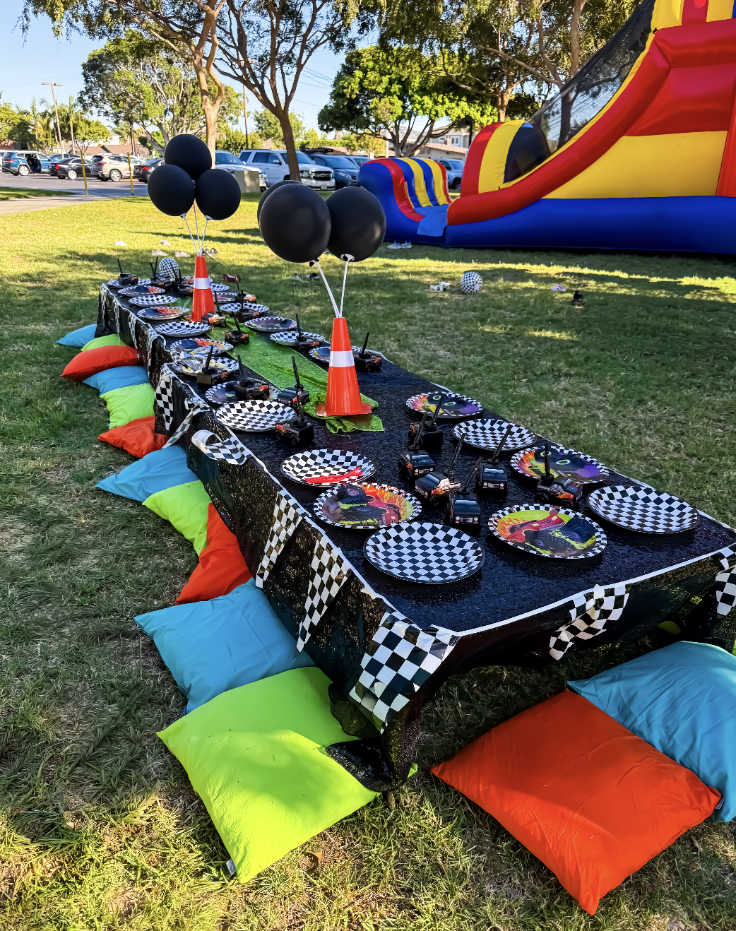 I love setting up little kids tables at my parties because it’s so fun for kids to all sit together for food, cake and crafts! We use 2 black storage tubs as “legs” for the table and put a piece of wood over the top for the tabletop! A normal sized tablecloth goes over the top and pillows go all around it for the kids to sit on! I bought the pillows in bulk on amazon and will buy new pillowcases for new party themes. Thankfully my kids consistently pick the same colors so I can reuse a lot.